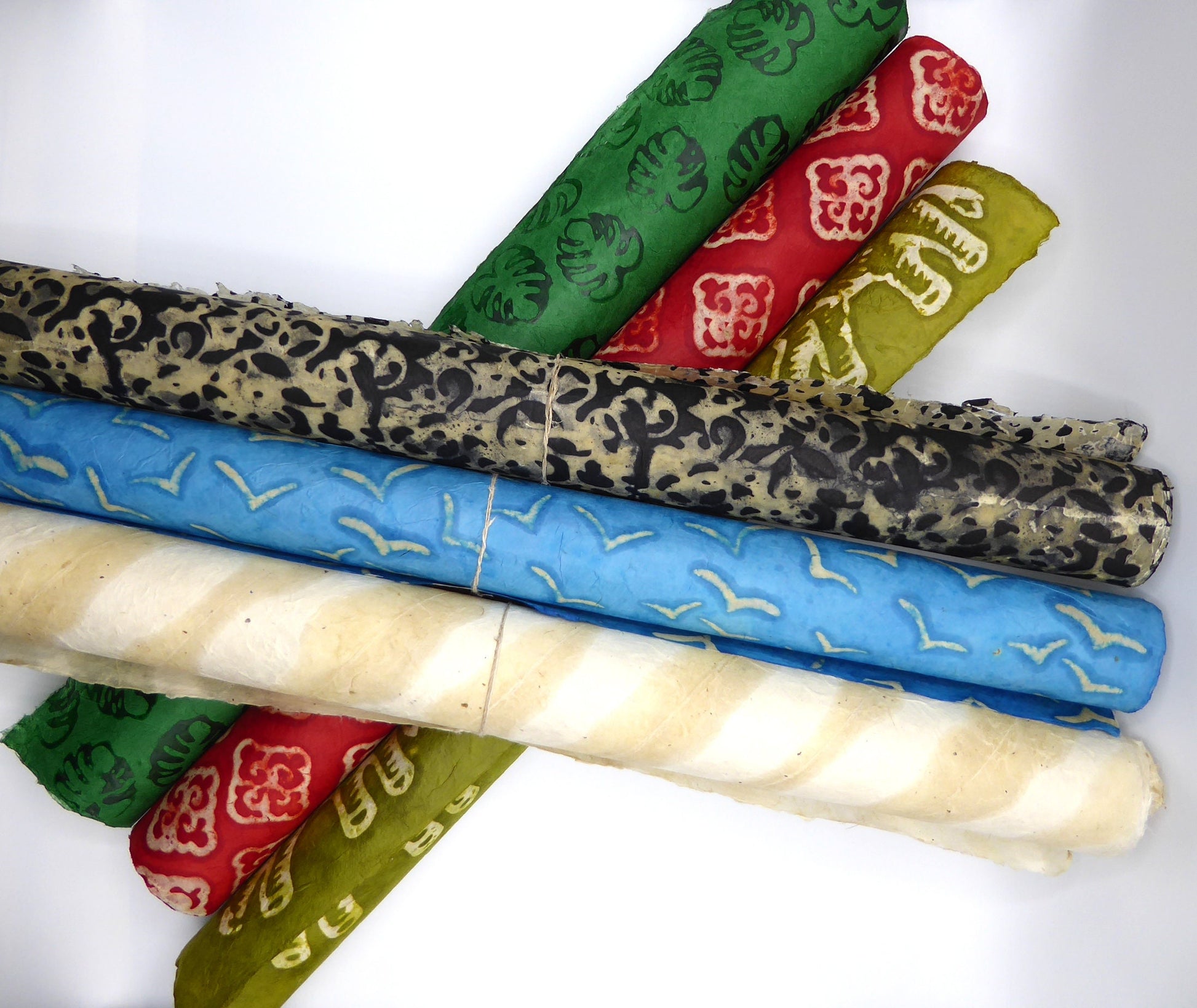 Using the wax method of Batik, when placed against the light it has the look of translucent stained glass. You have to touch this paper to truly appreciate how amazing it is.