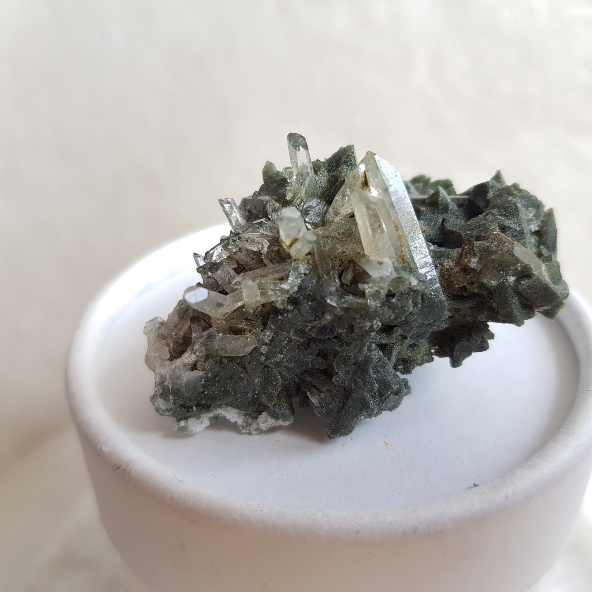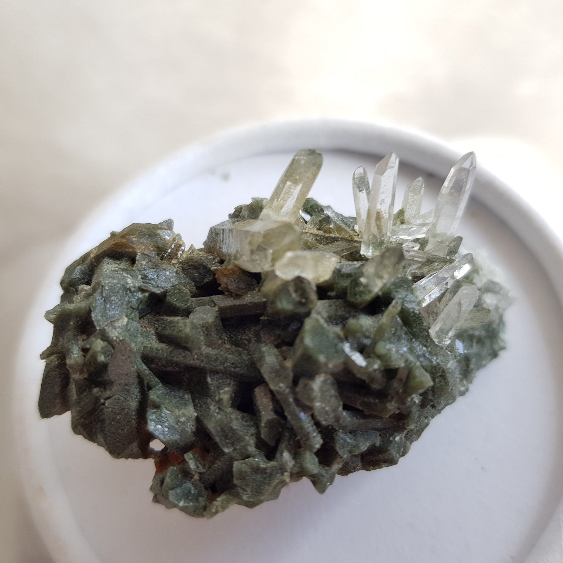 Stunning Chlorite Quartz crystal from Ganesh Himal, Nepal. Packaged in a handmade lokta paper box wrapped in upcycled newspaper. Everything has some kind of life and energy in it, crystals however are renowned for being incredible storehouses of energy, millions of years in the making deep underground! This particular crystal is found in Ganesh Himal, a beautiful mountain in the Nepali Himalayas. The crystal embodies a unique vibration from this mountain. Benefits of Chlorite Quartz: - Connection to Nature - Beneficial for personal aura - Regeneration and self-healing - Helps with spiritual growth by connecting to the earth - Protects from harmful radiation - Realignment of the body - Helps with assimilation of Vitamin A and E, iron, magnesium and calcium. What's so great about clusters of crystals? Since there are many crystals pointing commonly in many different directions this not only amplifies the energy of the crystals on a whole, it helps to scatter the positivity and remove negativity from an entire space. WEIGHT 37gram.