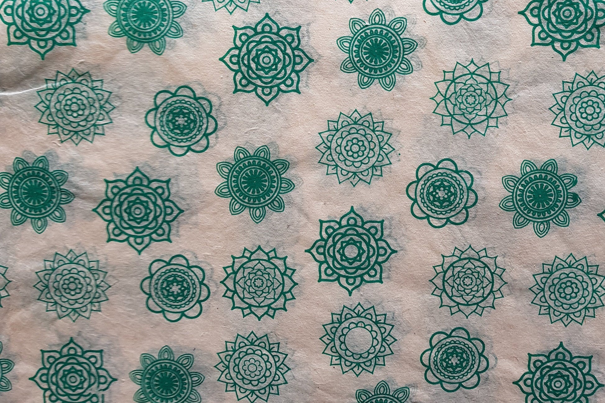 Handmade natural hemp tissue paper silk screen printed by our artisans in Kathmandu.