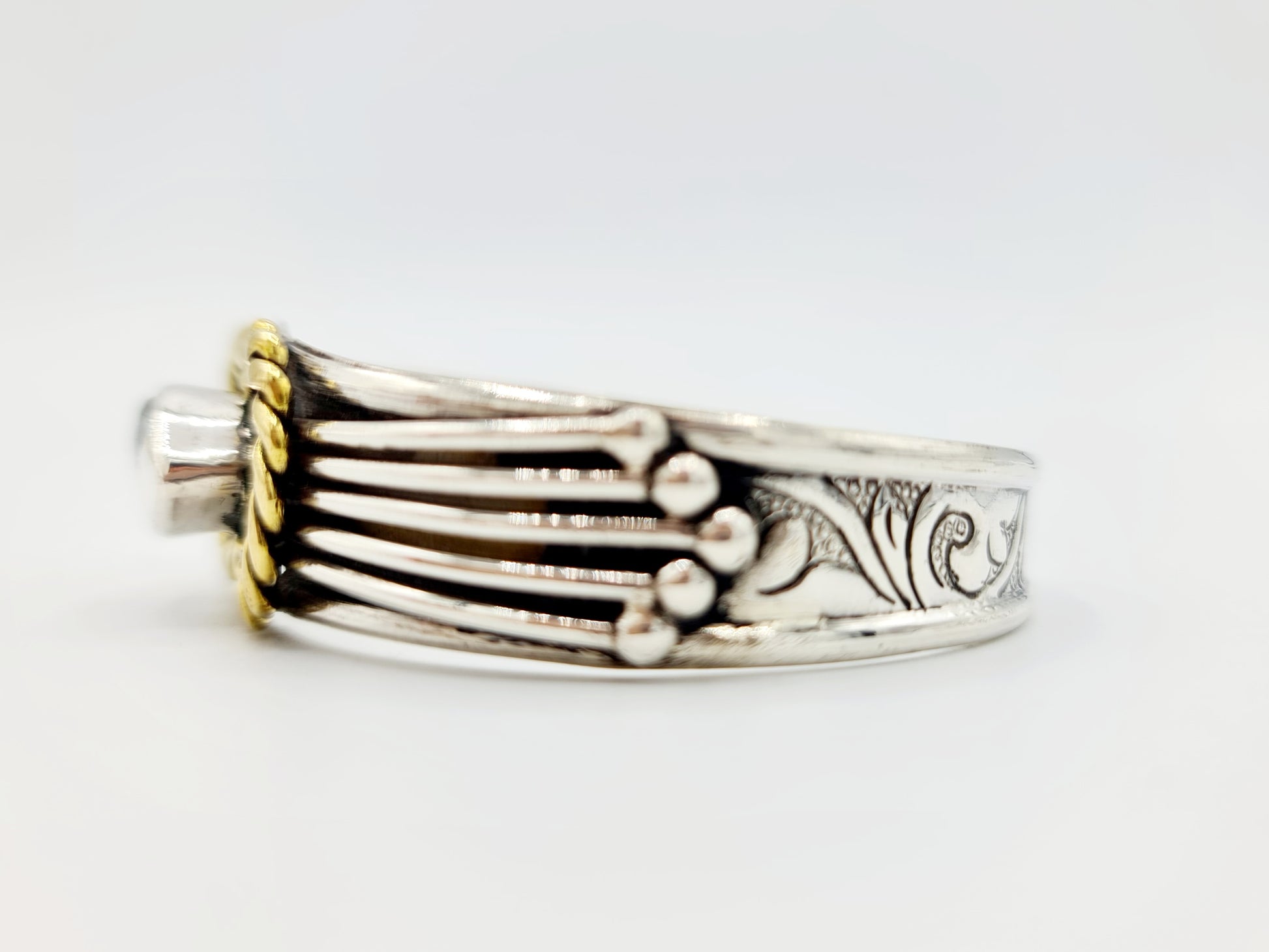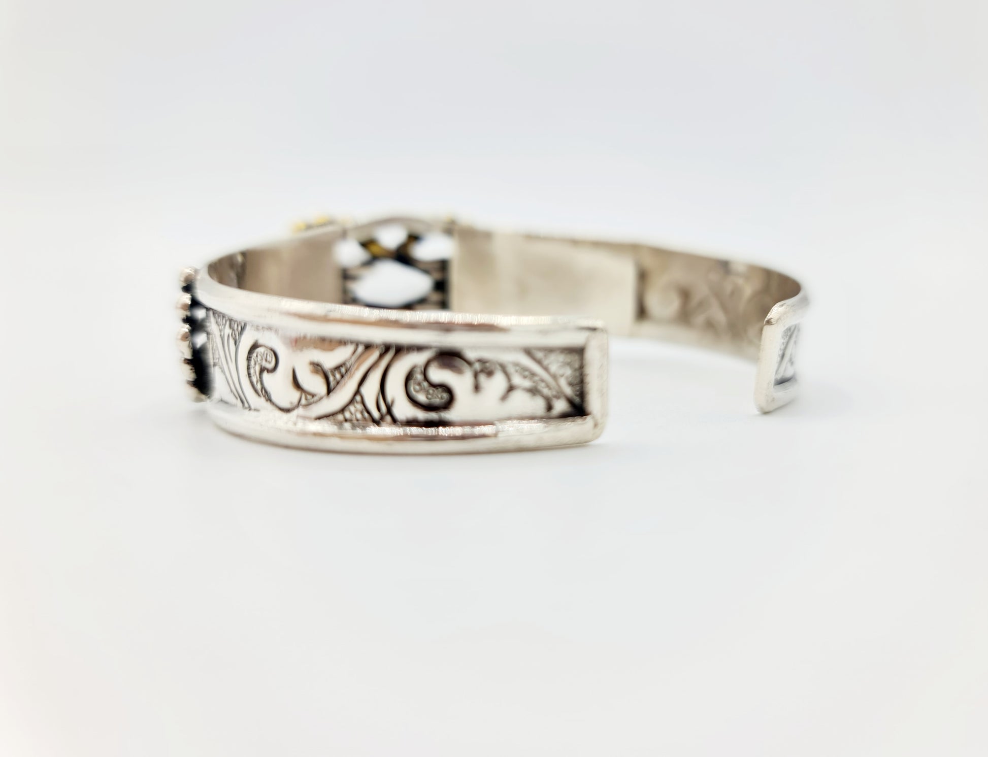 The white crystal stone is contrasted against 925 sterling silver and accented with a brass eternal knot design. Handmade in Nepal in an ethnic-navajo fusion style. Floral engravings are found on the main body of the cuff, whilst 7 arms of sterling silver and one brass eternal knot are the bridge where the white crystal stone sits a centre.