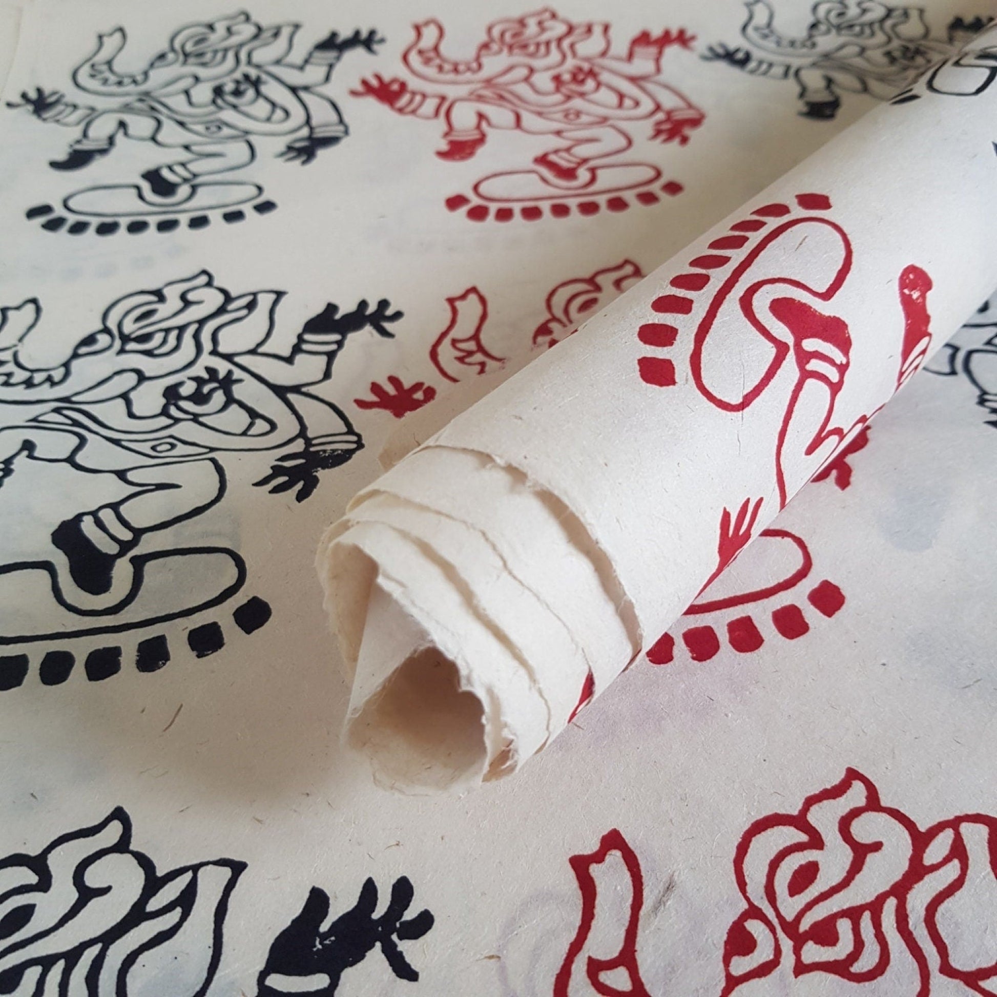Handmade natural lokta paper block printed by our artisans in Kathmandu with black and red ink using traditional wooden blocks.
