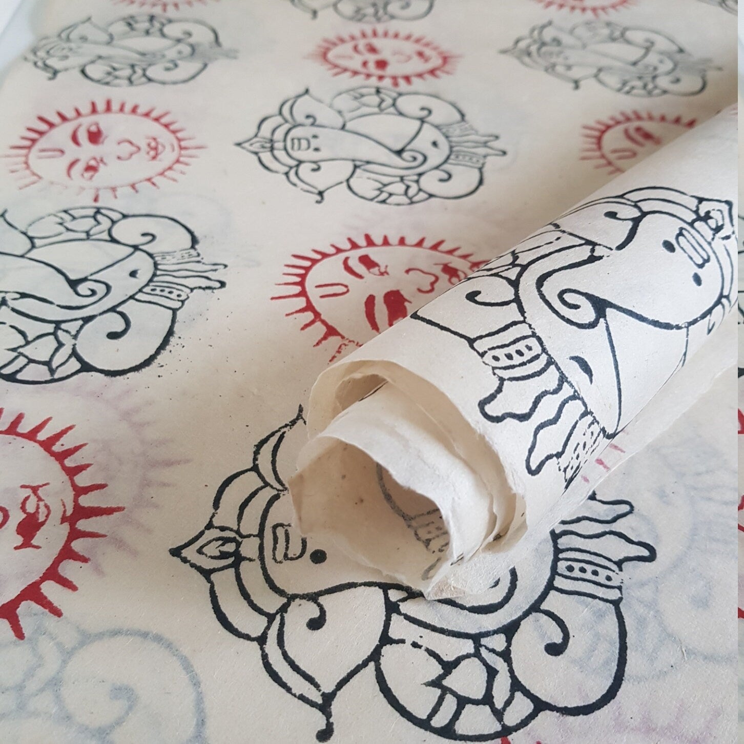 Ganesh and Sun Block Printed on Lokta Paper, Handmade, Tree Free & Sustainable