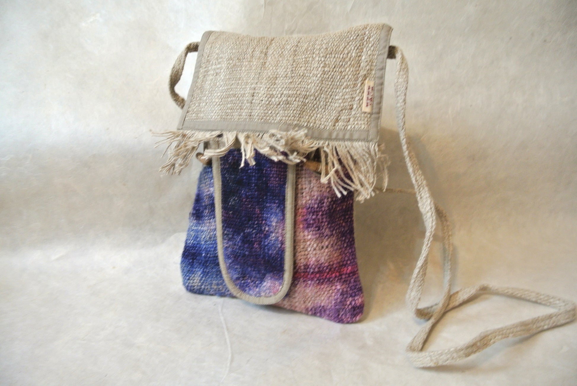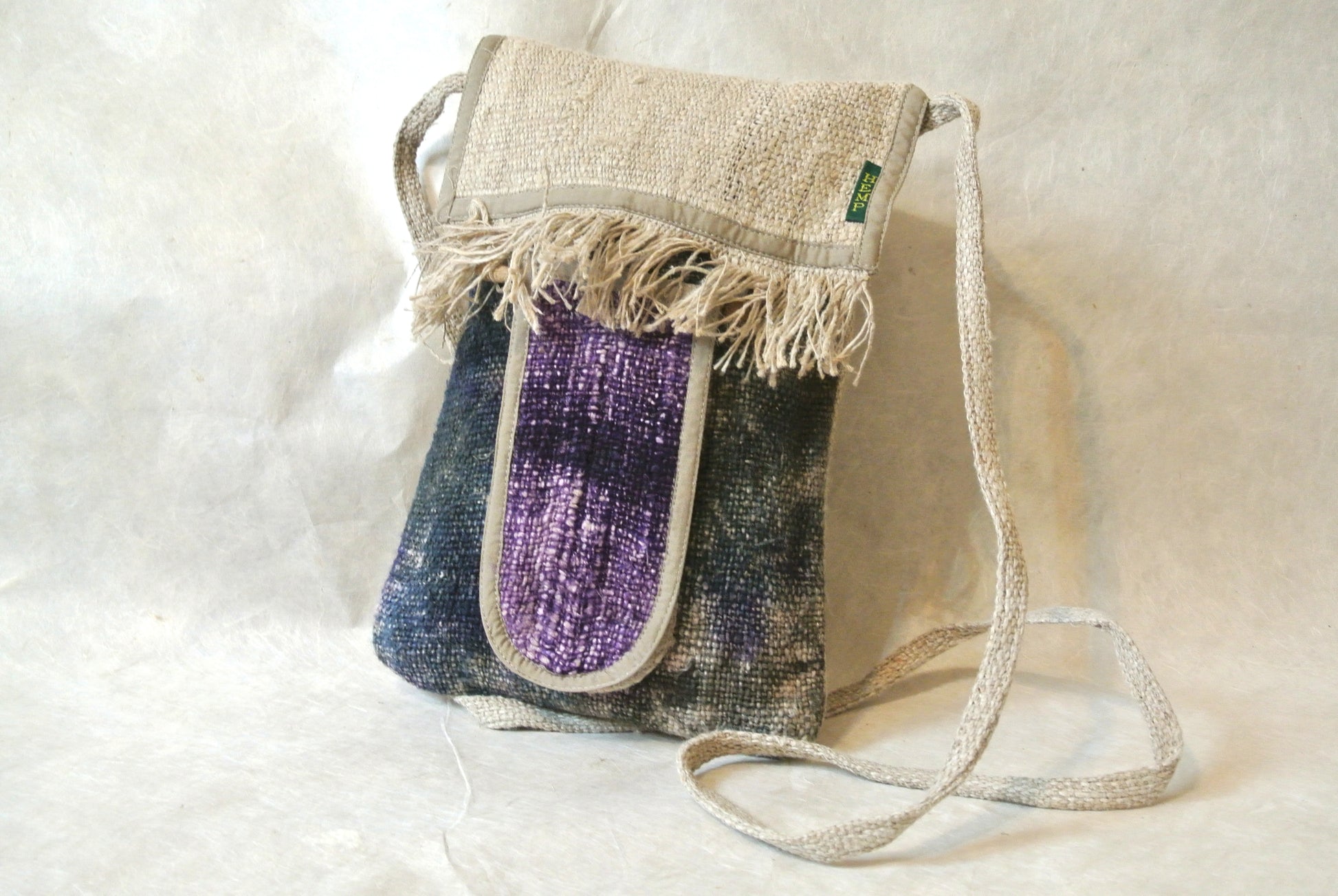 This bag is great for short trips to town or to take with you to music festivals. There is a wooden toggle and fringe detailing plus inner and outer pockets. It is dip-dyed indigo, purple, pink and green. As each bag is dyed individually they each have a unique mix of colours.