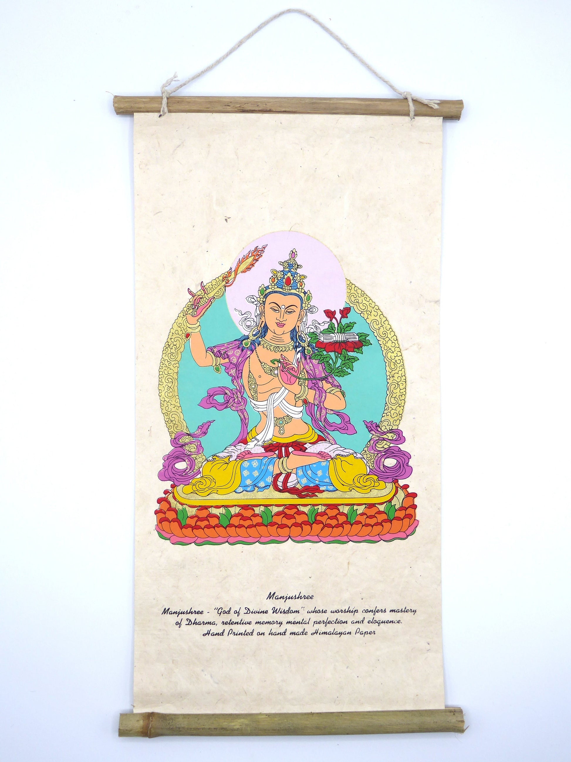 The designs have been hand-stamped in layers for each colour onto tree free lokta paper and attached to bamboo sticks to replicate a scroll, adding to it's charm as well as the weight of the picture making it ready for hanging. Perfect to hang in your yoga studio or place of therapeutic practice at home. (Therapy, Yoga, Spa, Pilates, Meditation, Prayer Room etc.)
