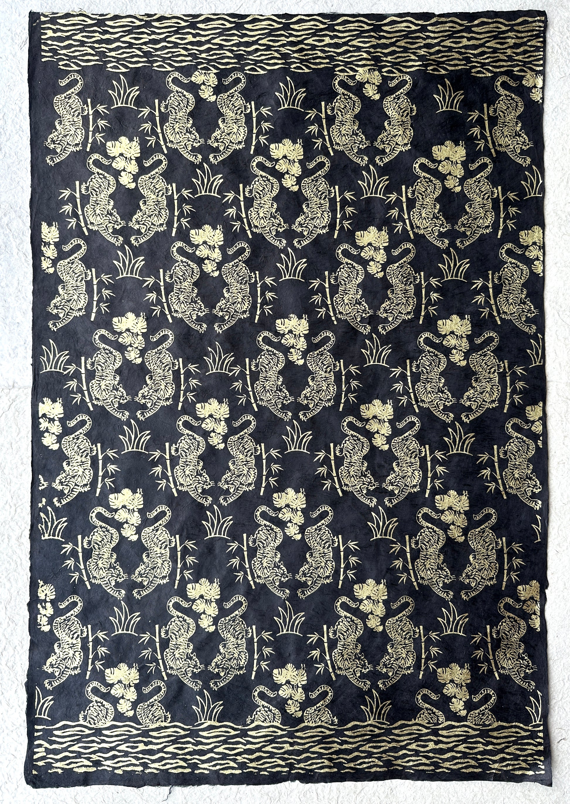 This bundle includes one sheet of each vintage handmade paper prints, totalling six sheets in one bundle; 1. Spark - red 2. Spark - brown 3. Tiger play - black 4. Tiger play - red 5. Tiger play blue